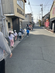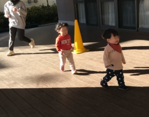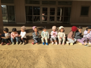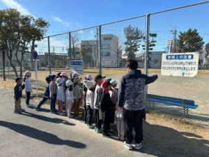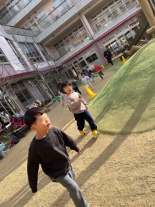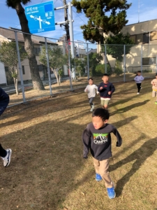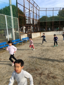 年長、年中児は近所の相生公園へ歩いていき、グラウンドをお借りして力一杯走り切りました。(遊具等がある園庭は本気で走ると危険なため)