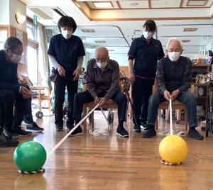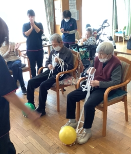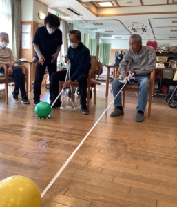 本日は、輪っかに入ったボールに紐をつけて、引っ張るゲーム~🥎