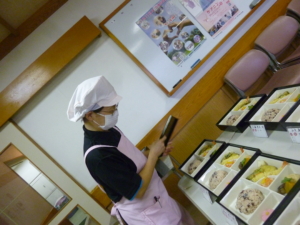 いつもより広い食堂で弁当箱を並べ盛りつけ