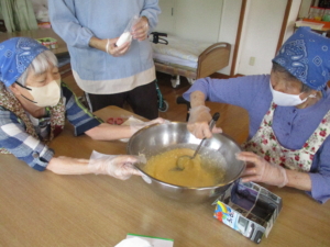 協力して材料を混ぜます。量が多いので