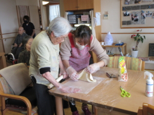 ユニットでの入居者の皆さんの一日を紹介いたします。天気の良い日に、職員と一緒に洗濯を干して、その後、おやつは皆でうどんを粉から打って作りました。入居者の皆さんから「手作りうどんは美味しい」との声が聞かれ、うららかな心地よい一日でした。