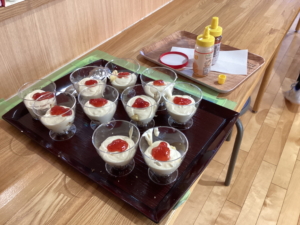 完成品にイチゴジェルやハチミツをトッピングしてお召し上がりいただきました。