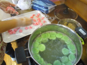 色をつけたものを形を整え茹でます。